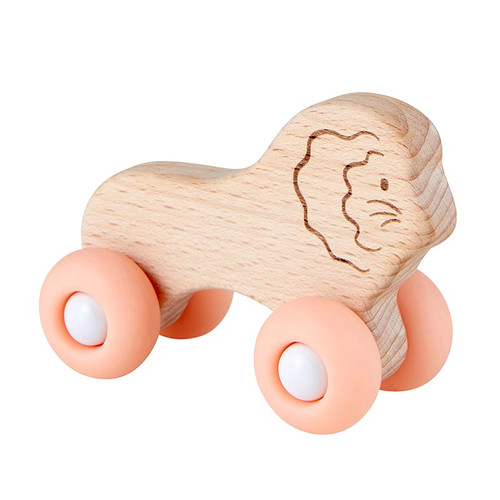 Natural wood lion shaped toy includes soft silicone wheels to roll along with baby. Helps to soothe baby during the teething stages.